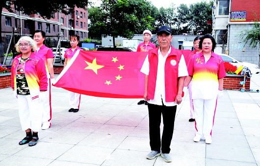 圖為張秀英(左一)在小區(qū)和居民們一起舉行升國旗儀式。 (資料圖片)