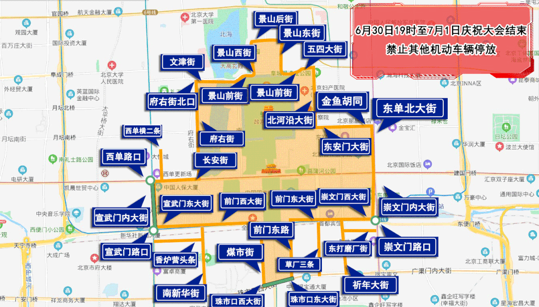 6月30日19時至7月1日慶祝大會結(jié)束,由府右街北口經(jīng)府右街、長安街、西單路口(不含)、宣武門內(nèi)大街(不含)、宣武門路口(不含)、宣武門東大街、前門西大街、煤市街、珠市口西大街(不含)、珠市口東大街(不含)、前門東路、前門東大街、崇文門西大街、崇文門路口(不含)、崇文門內(nèi)大街、東單北大街、金魚胡同、東安門大街、北河沿大街、五四大街、景山前街、景山東街、景山后街、景山西街、景山前街、文津街至府右街北口以內(nèi)區(qū)域、西單橫二條、祈年大街、東打磨廠街、南新華街、香爐營頭條、草廠三條、前門肯德基停車場,除持有慶祝大會專用證件的車輛外,禁止其他機動車輛停放。