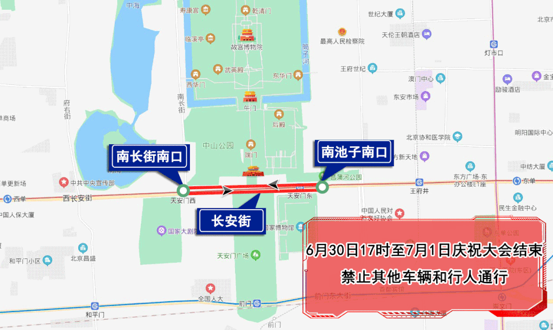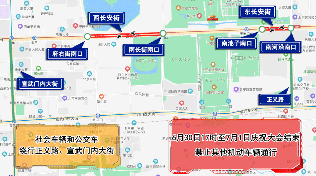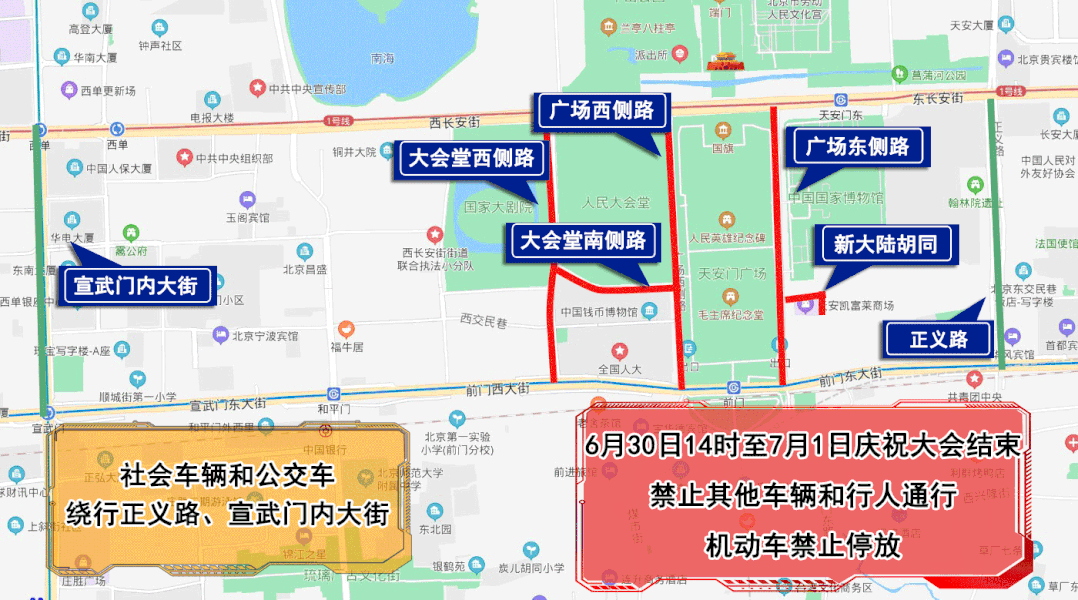 6月30日14時至7月1日慶祝大會結(jié)束,人民大會堂西側(cè)路、人民大會堂南側(cè)路、天安門廣場東側(cè)路、天安門廣場西側(cè)路、新大陸胡同,除持有慶祝大會專用證件的車輛和人員外,禁止其他車輛和行人通行,機動車禁止停放。社會車輛和公交車經(jīng)正義路、宣武門內(nèi)大街繞行。
