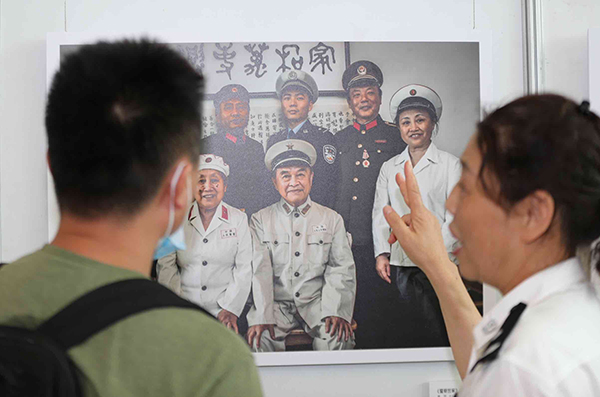 一位頭發(fā)花白的老人微微佝僂著身子,仔細(xì)觀看一幅名為《戰(zhàn)“疫”時(shí)期》的攝影作品。