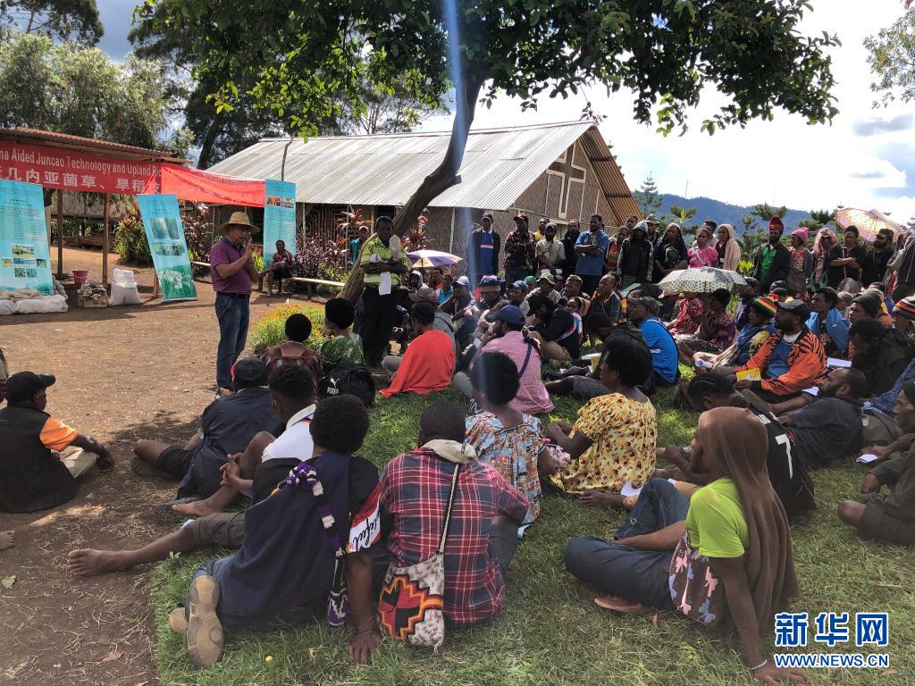 2020年12月15日,林應(yīng)興(戴草帽者)在巴布亞新幾內(nèi)亞?wèn)|高地省中國(guó)援助巴新菌草和旱稻技術(shù)項(xiàng)目第9期培訓(xùn)班上授課。新華社發(fā)