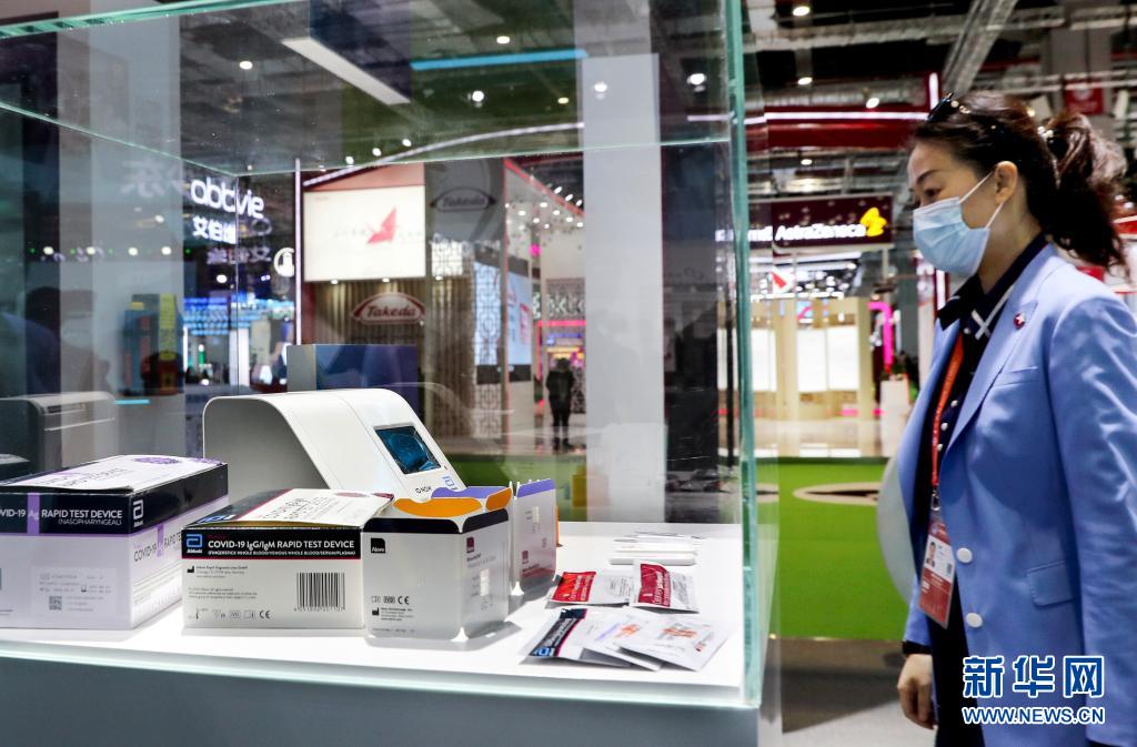 在第三屆中國(guó)國(guó)際進(jìn)口博覽會(huì)公共衛(wèi)生防疫專區(qū),參觀者觀看雅培展示的便于攜帶且適用于大規(guī)模檢測(cè)的新冠病毒快速抗原檢測(cè)試劑和產(chǎn)品(2020年11月5日攝)。新華社記者 劉穎 攝