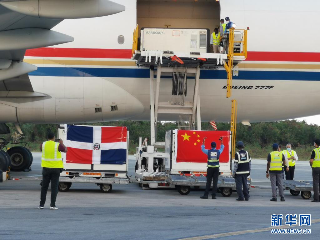 這是2021年3月17日,運(yùn)載中國(guó)援助的新冠疫苗等物資的飛機(jī)抵達(dá)多米尼加首都圣多明各。新華社發(fā)(中國(guó)駐多米尼加大使館供圖)