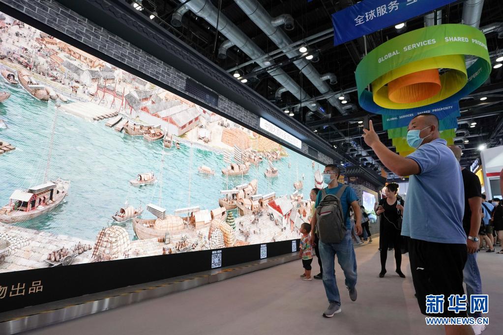 在2020年中國(guó)國(guó)際服務(wù)貿(mào)易交易會(huì)綜合展區(qū),參觀者在參觀展出的《穿越時(shí)空的大運(yùn)河》數(shù)字影像(2020年9月6日攝)。新華社記者 鞠煥宗 攝