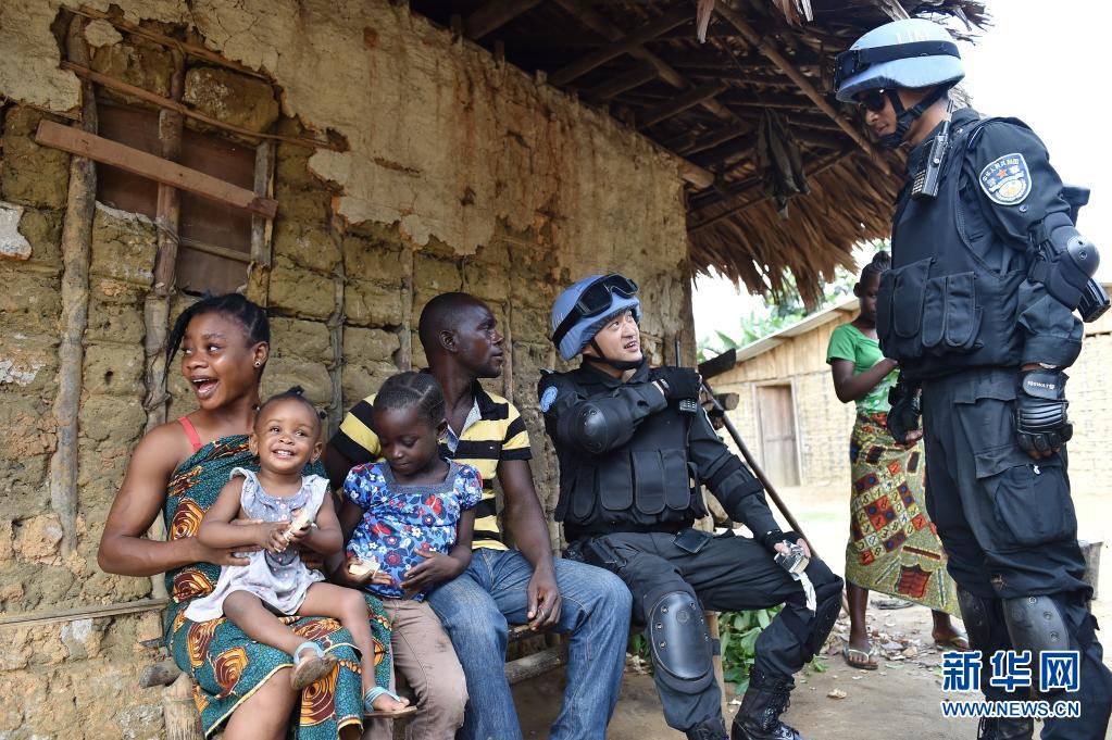 中國(guó)維和警察防暴隊(duì)隊(duì)員在利比里亞格林維爾的一座村莊詢問(wèn)當(dāng)?shù)刂伟驳惹闆r(2015年11月3日攝)。新華社記者 孫瑞博 攝