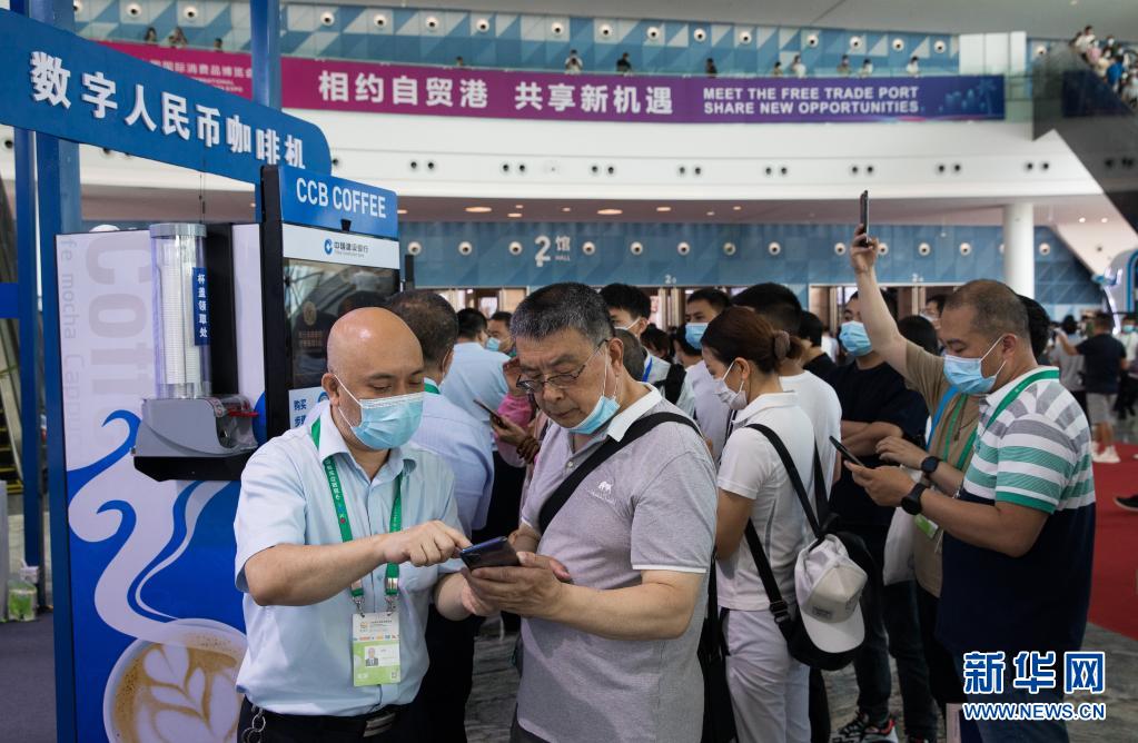 在??谂e行的首屆中國(guó)國(guó)際消費(fèi)品博覽會(huì)上,參觀者體驗(yàn)數(shù)字人民幣咖啡機(jī)(2021年5月10日攝)。新華社記者 金立旺 攝