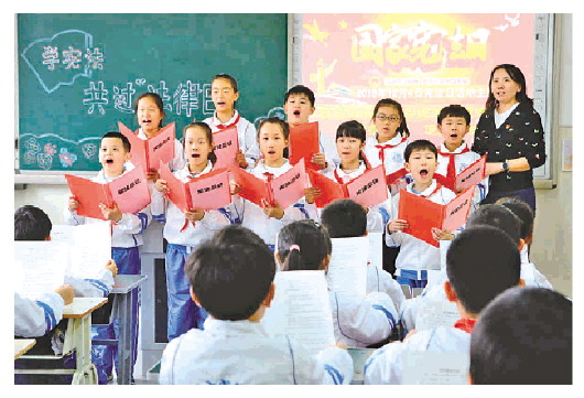 2018年12月3日,天津市實驗小學的孩子們在老師的帶領下誦讀學習憲法。 新華社記者 劉東岳 攝