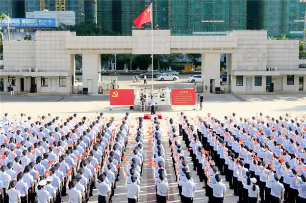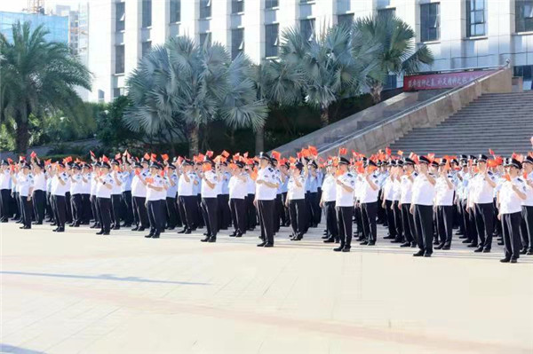 “我宣誓,我志愿加入中國共產(chǎn)黨,擁護黨的綱領(lǐng),遵守黨的章程,履行黨員義務(wù)……”升旗儀式結(jié)束后,閆希軍帶領(lǐng)全體人員列陣而立,緊握高舉的右拳,重溫了入黨誓詞。隨后,全體人員共同演唱了《沒有共產(chǎn)黨就沒有新中國》《中國人民警察警歌》,鏗鏘有力的歌聲響徹現(xiàn)場,把歌聲獻給黨,彰顯了海南公安機關(guān)廣大公安民警輔警向黨和人民獻禮的決心和信心。