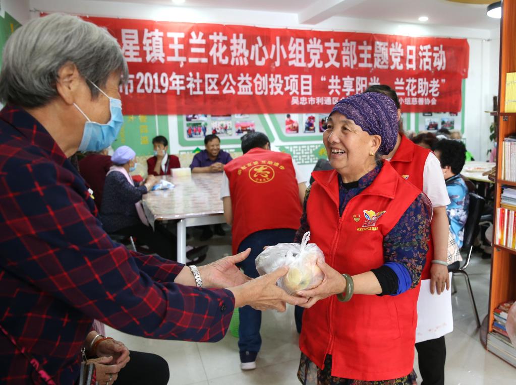 王蘭花(右)向來(lái)到蘭花志愿服務(wù)站參加活動(dòng)的老人發(fā)放“愛(ài)心水果”。(2020年6月23日攝)新華社記者賈浩成攝