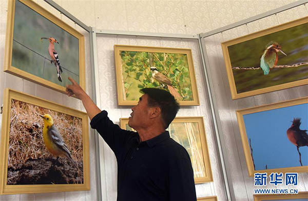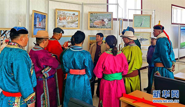 6月7日,廷·巴特爾介紹他在草場拍攝的野生鳥類照片。 新華社記者 恩浩 攝