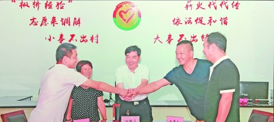 發(fā)揚新時代“楓橋經(jīng)驗”,運用法治思維和法治方式化解矛盾糾紛。圖為在浙江省諸暨市楓橋鎮(zhèn)調(diào)解志愿者聯(lián)合會的調(diào)解下,當(dāng)事人握手言和。