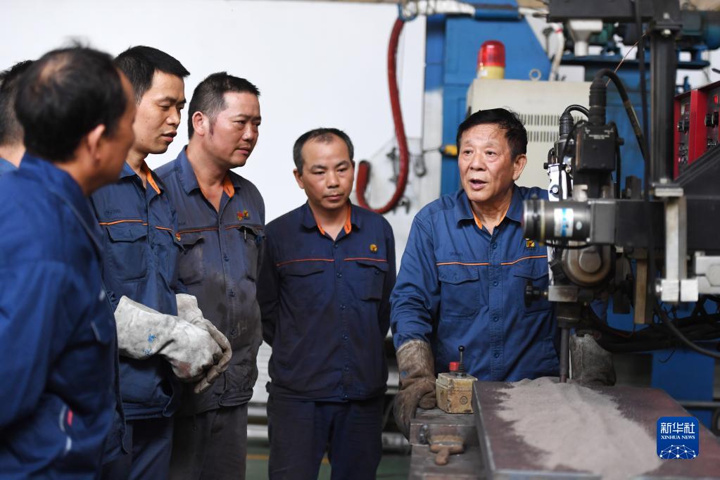 6月17日,艾愛國(左一)在湖南湘潭湘鋼高級技工學校焊接實習基地檢查學生的焊接作業(yè)。新華社記者 薛宇舸 攝