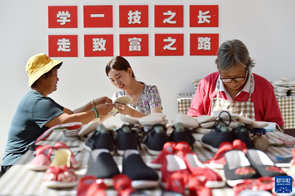 9月2日,在河北省平山縣北莊村的“團結北莊手工坊”里,當?shù)貗D女在縫制手工布鞋。 新華社發(fā)(張曉峰 攝)