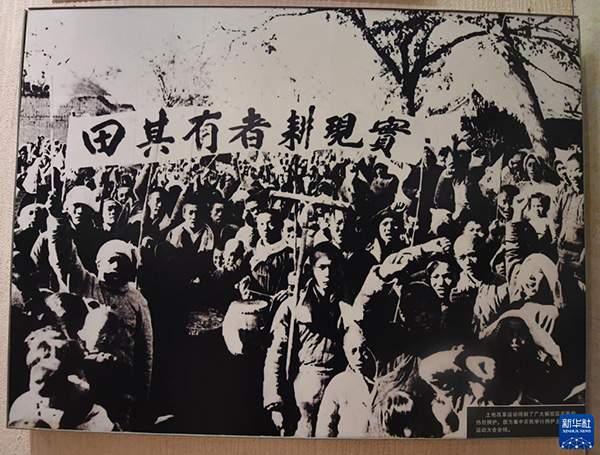 這是在西柏坡紀念館拍攝的照片,反映的是冀中農(nóng)民舉行擁護土地改革運動大會(2019年4月9日攝)。 新華社記者 朱旭東 攝