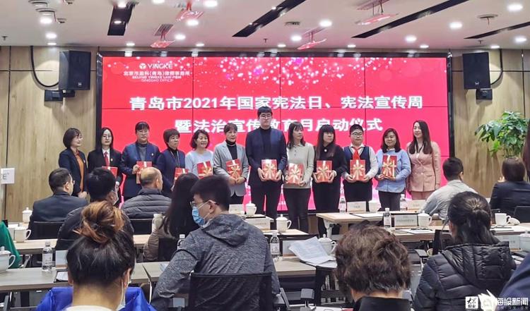 儀式在“我是憲法朗讀者”宣傳片的朗朗誦讀聲中開始,劉春穎同志與有關(guān)領(lǐng)導為學法講法優(yōu)秀代表贈送憲法書籍,并宣布“青島市2021年國家憲法日、憲法宣傳周暨法治宣傳教育月主題宣傳活動正式啟動”。
