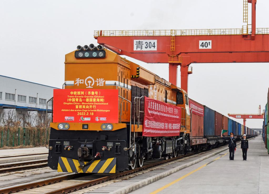 2月18日,中歐班列(齊魯號)中國青島—德國曼海姆雙向?qū)﹂_首班列車從上合示范區(qū)青島多式聯(lián)運(yùn)中心出發(fā)。(新華社發(fā),王昭脈攝)