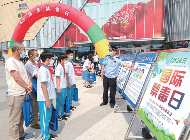 在“6·26”國(guó)際禁毒日即將來(lái)臨之際,6月11日,山東省膠州市委政法委、市人民法院、市人民檢察院、市教育和體育局、市公安局、市婦女聯(lián)合會(huì)、市公證處、市法學(xué)會(huì)等部門在膠州市龍湖天街廣場(chǎng)聯(lián)合開(kāi)展禁毒宣傳活動(dòng),進(jìn)一步推進(jìn)禁毒宣傳,營(yíng)造“社會(huì)群眾齊齊參與,禁毒知識(shí)人人知曉”的全民禁毒良好氛圍。圖為膠州市公安局禁毒大隊(duì)民警向群眾講解禁毒知識(shí)。