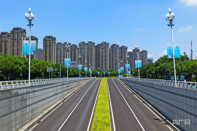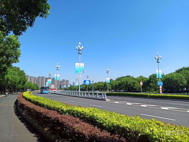 道路兩側(cè)以峰會為主題的道旗迎風(fēng)而立(央廣網(wǎng)記者 羅曉英 攝)