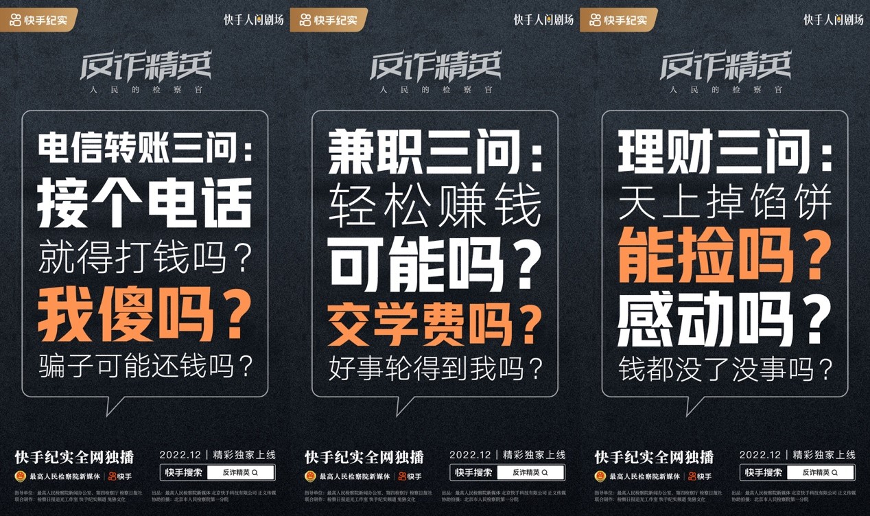 單親媽媽為何深陷“殺豬盤”執(zhí)迷不悟?什么樣的項目專騙老年人還屢屢得手?詐騙分子如何一人分飾多角?現(xiàn)實中,電信網(wǎng)絡(luò)詐騙犯罪愈演愈烈,亟需人們提高警惕。近日,反電信網(wǎng)絡(luò)詐騙法正式施行。由最高人民檢察院新聞辦公室、第四檢察廳及檢察日報社指導(dǎo),最高人民檢察院新媒體、快手及正義傳媒聯(lián)合出品的反詐主題紀(jì)實短劇《反詐精英——人民的檢察官》(以下簡稱“《反詐精英》”)于2022年12月10日在快手獨(dú)家上線,@最高人民檢察院 @正義網(wǎng) 兩大快手賬號首發(fā)?!斗丛p精英》從奮戰(zhàn)在辦案一線的人民檢察官視角出發(fā),以富有戲劇張力的紀(jì)實短劇形式講述真實反詐故事,創(chuàng)新呈現(xiàn)專業(yè)普法內(nèi)容。